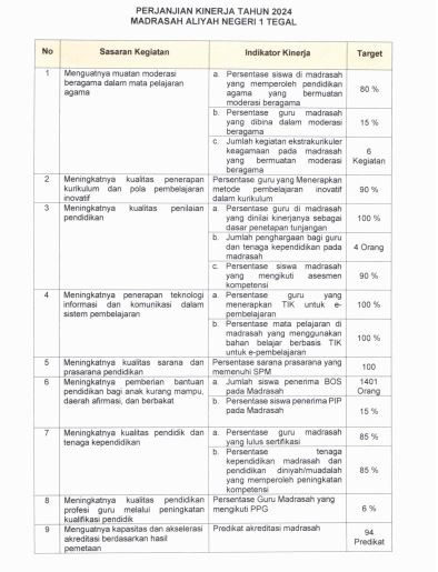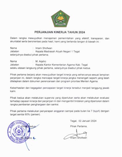 Tegal, [Tanggal] – Dalam upaya meningkatkan efektivitas dan akuntabilitas kinerja, Kepala Madrasah Aliyah Negeri (MAN) 1 Tegal secara resmi menerbitkan Perjanjian Kinerja (Perkin) Tahun 2024. Dokumen ini menjadi pedoman bagi seluruh tenaga pendidik dan kependidikan dalam menjalankan tugas serta mencapai target yang telah ditetapkan.