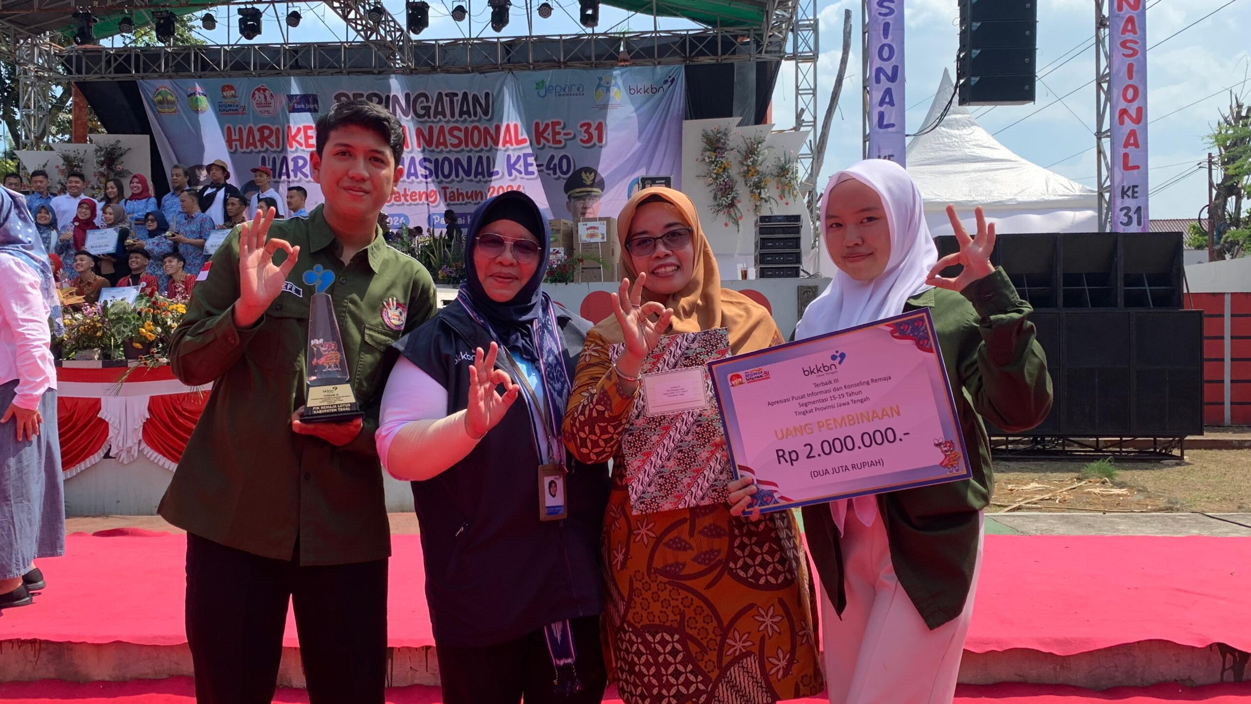 Slawi – Penganugerahan Apresiasi PIK-R (Pusat Informasi Konseling Remaja) telah dilaksanakan oleh BKKBN (Badan Kependudukan Keluarga Berencana Nasional) Jawa Tengah yang bertepatan dengan acara peringatan Hari Keluarga Nasional (Harganas) di Pantai Kartini, Kabupaten Jepara, Sabtu (22/6).