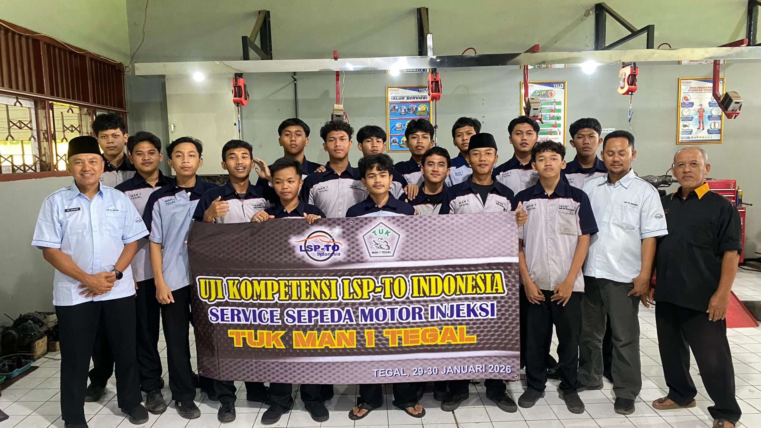 Lebaksiu — Untuk pertama kalinya, Jurusan Teknik Bisnis Sepeda Motor (TBSM) MAN 1 Tegal melaksanakan Uji Kompetensi Keahlian (UKK) bersertifikat Badan Nasional Sertifikasi Profesi (BNSP) Kamis, (29/1). Kegiatan bertempat di bengkel TBSM madrasah yang menjadi tonggak penting dalam peningkatan mutu lulusan madrasah, khususnya pada program keterampilan vokasional yang berorientasi pada dunia kerja.